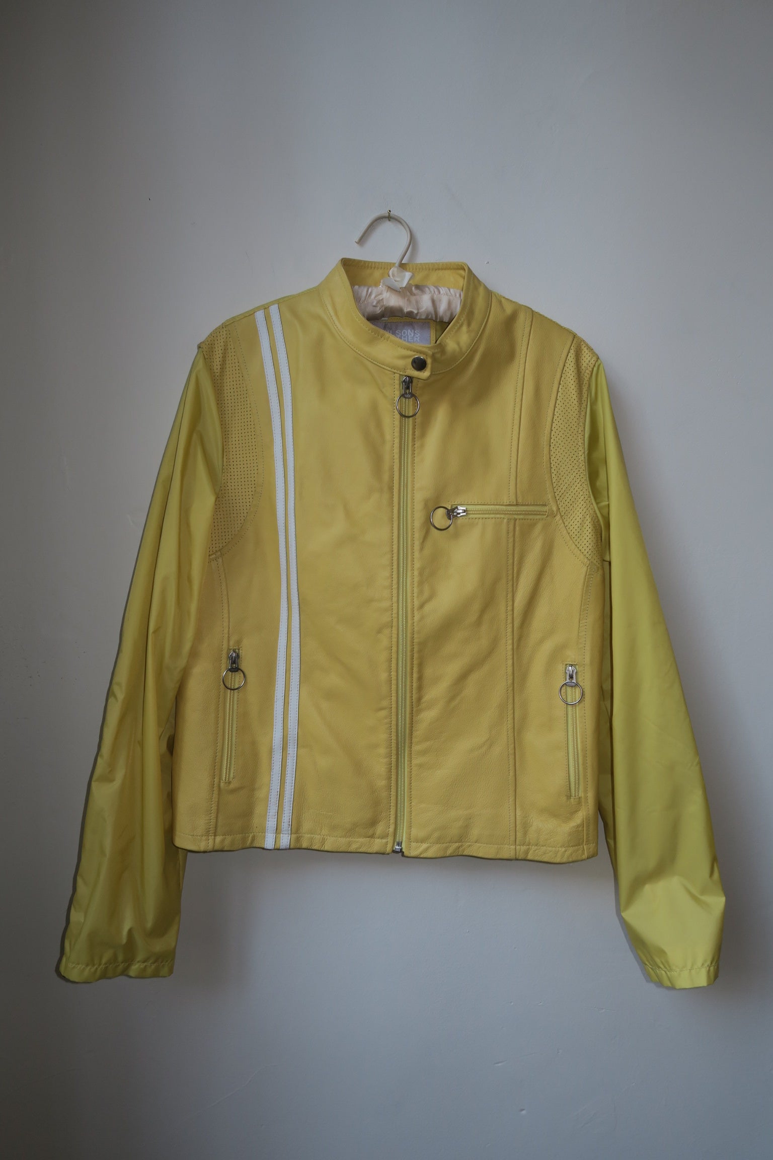 Light yellow leather and nylon jacket. Leather torso, nylon sleeves. Athletic look.